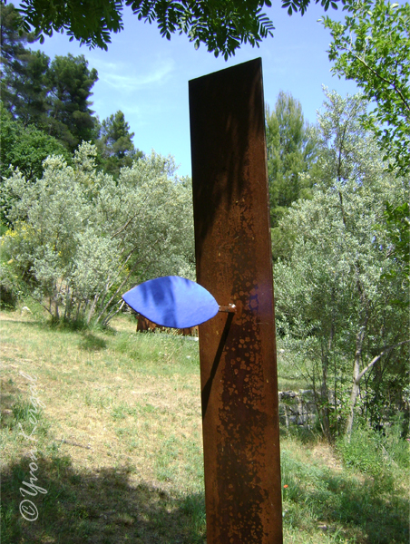 Steel sculpture, blue enamel eye